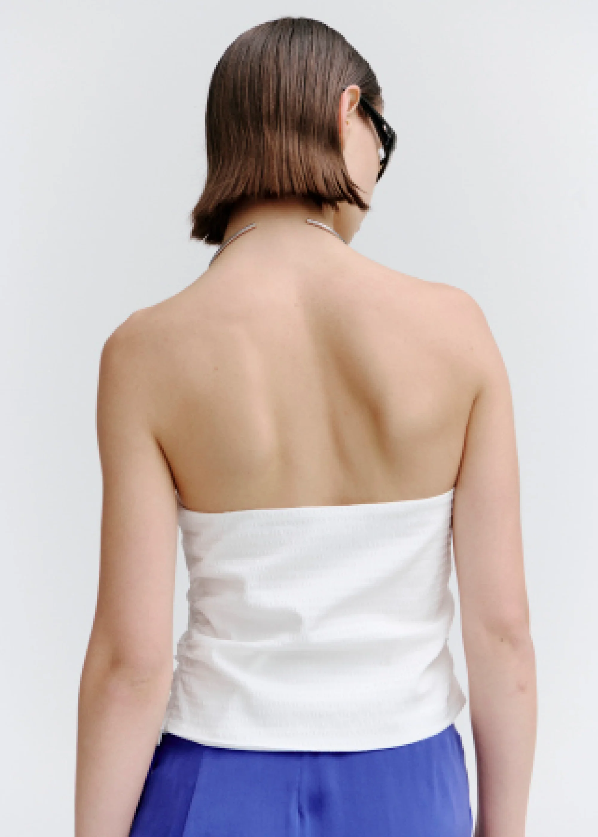 Sculptural bustier with minimalist tailored details, including a flattering, gently curved neckline and gathered sides.
