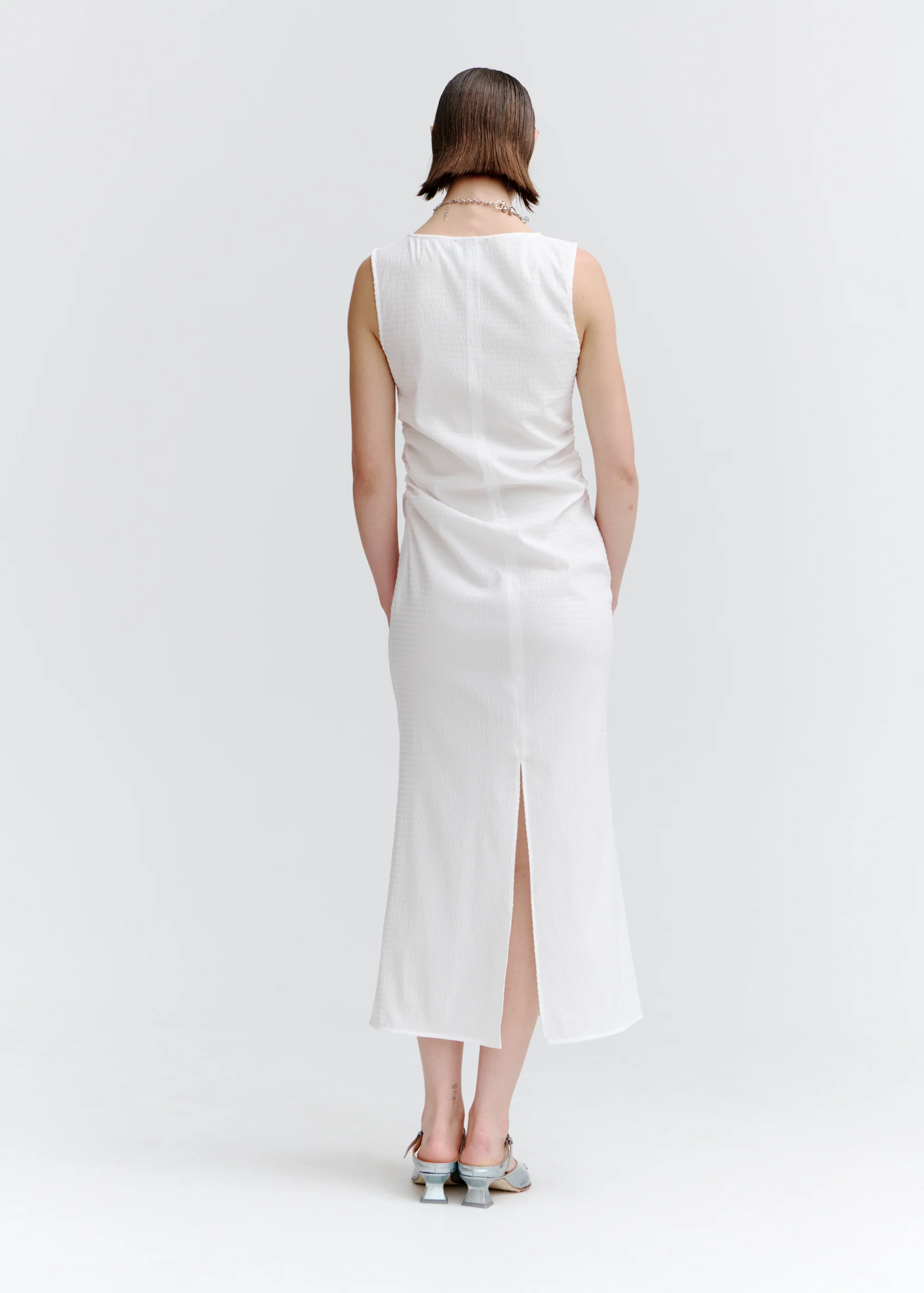 A low-key shift dress in a flattering cut, that finishes on the calf and features soft gathering through the side waist.
