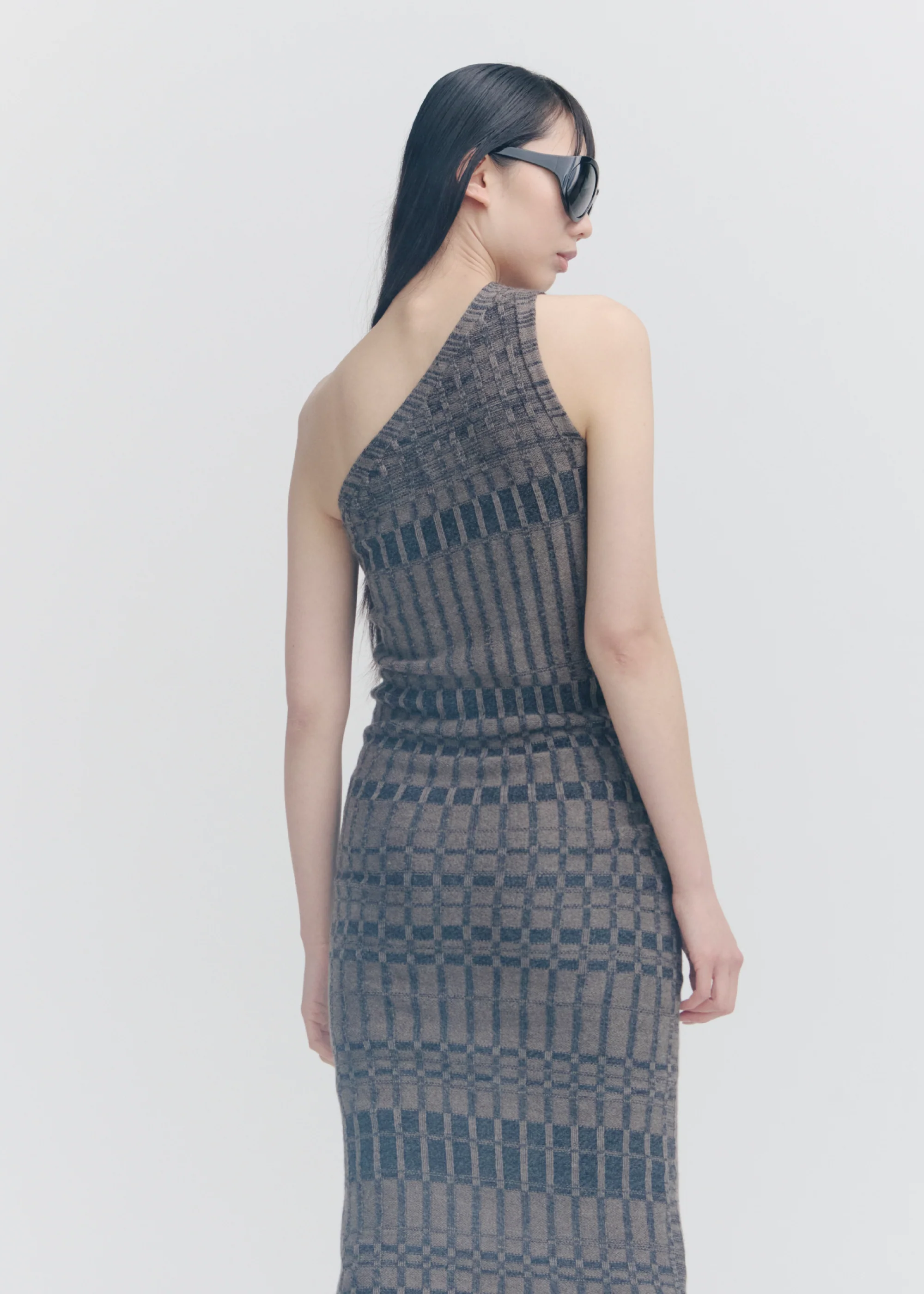 Asymmetric longline dress with an engineered wide-rib construction and a minimal, fitted silhouette.