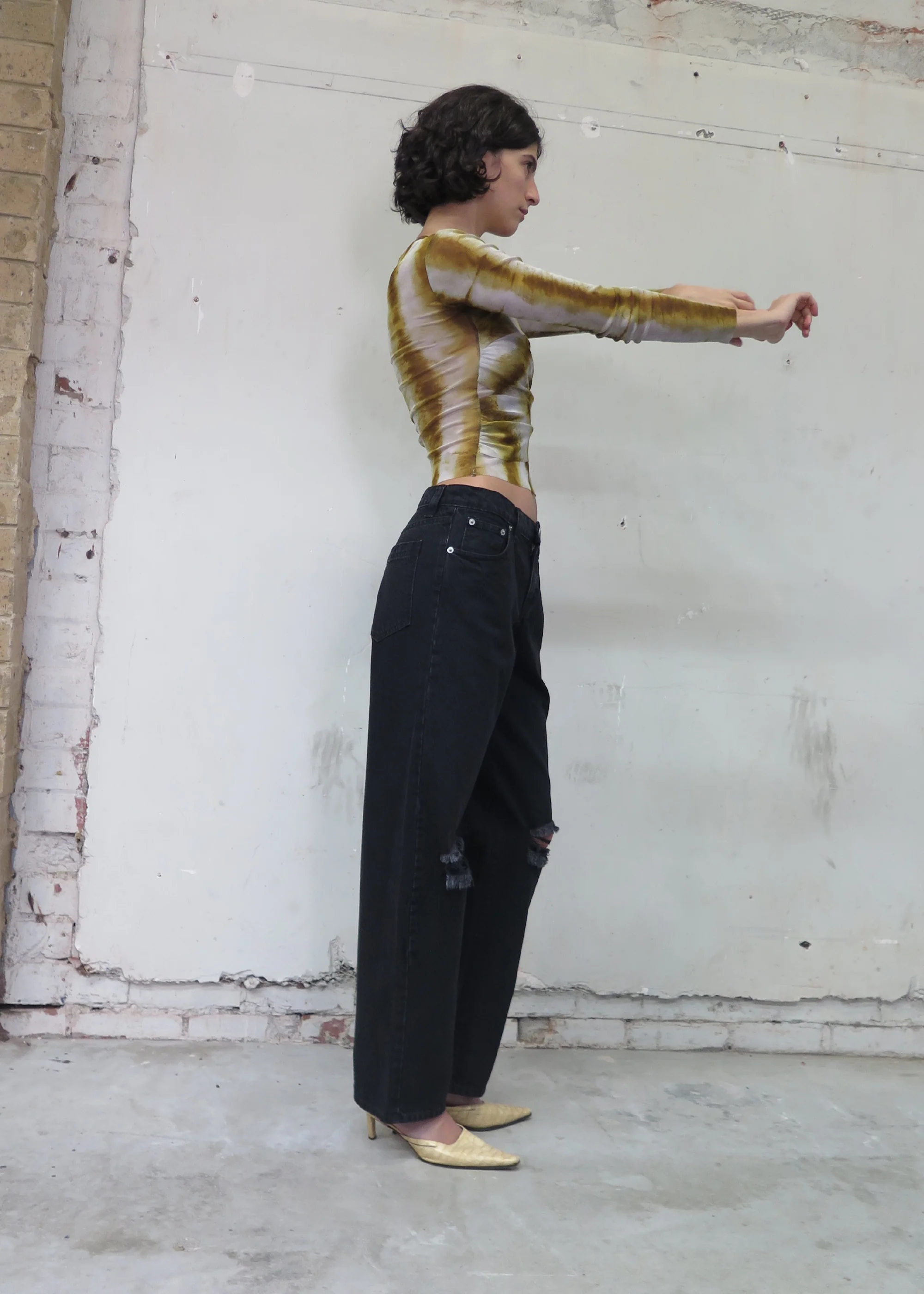 Laundered low-rise jeans featuring hand-distressed splits at each knee, and hemline darts that create a gentle barrel leg silhouette.